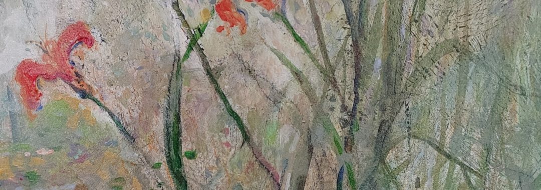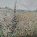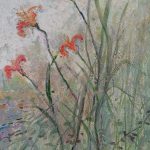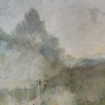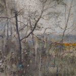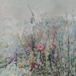His current work explores nature’s elements and the quality of light on the garden and landscape. His tequnique is acrylic glaze over a heavily cracked wood and canvas…. giving the illusion of an old distressed oil.