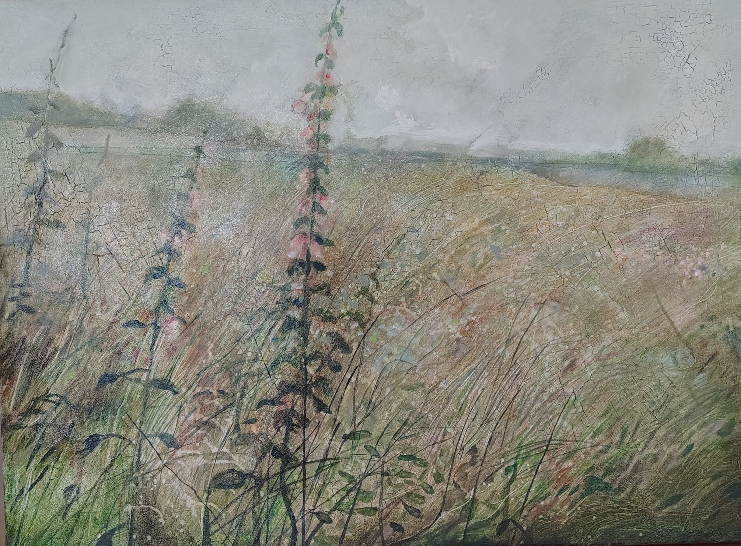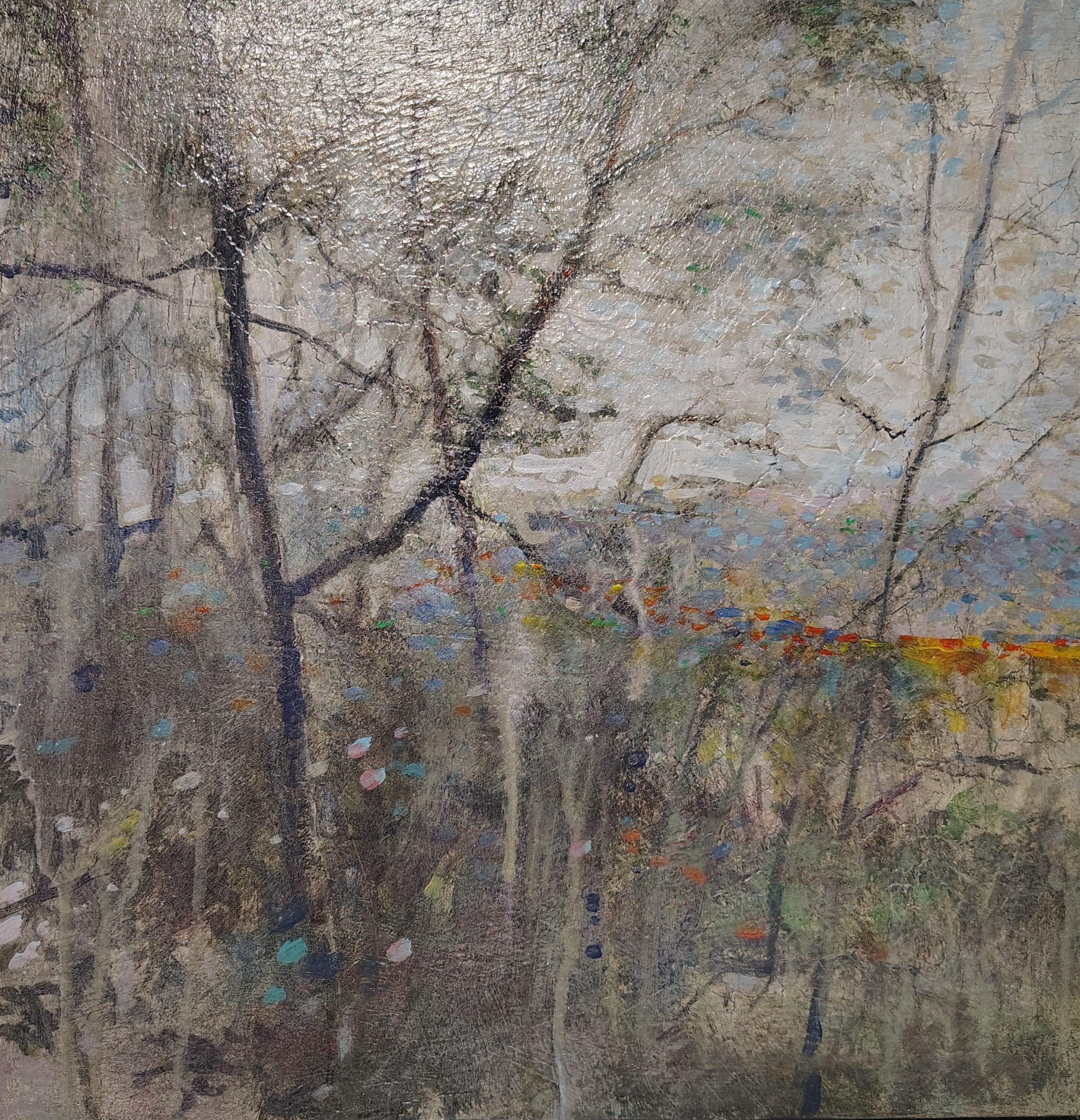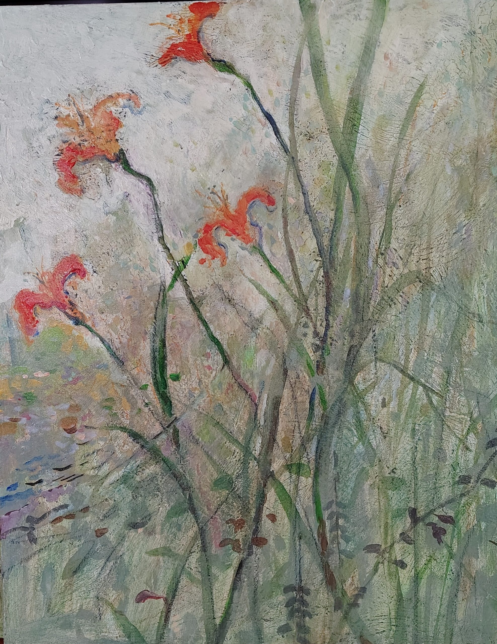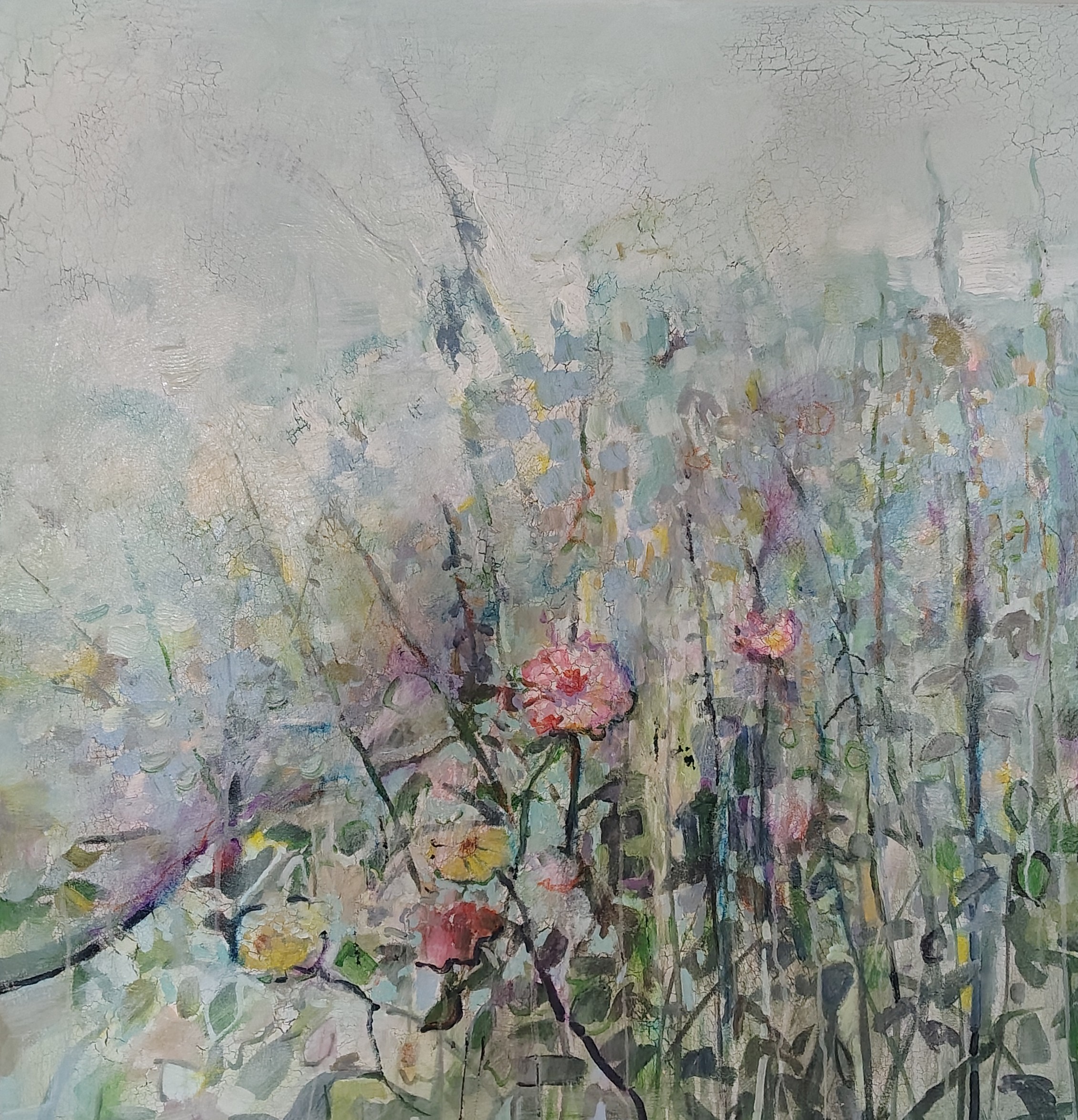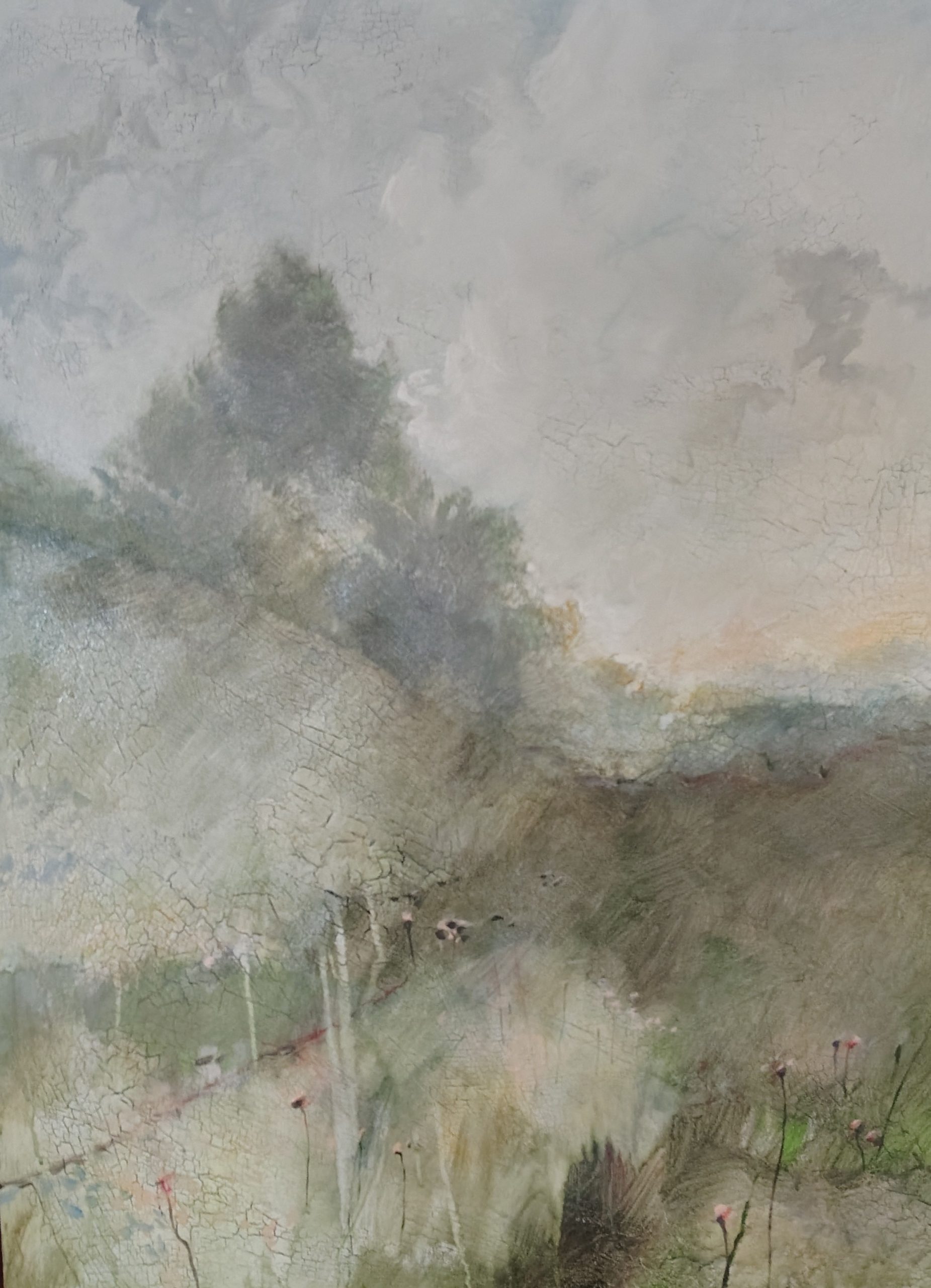 His current work explores nature’s elements and the quality of light on the garden and landscape. His tequnique is acrylic glaze over a heavily cracked wood and canvas…. giving the illusion of an old distressed oil.